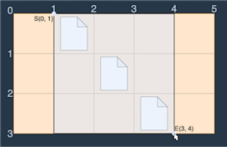 이러한 바탕화면에서 다음 그림과 같이 S(0, 1)에서 E(3, 4)로 드래그하면 세 개의 파일이 모두 선택되므로 드래그 한 거리 (3 - 0) + (4 - 1) = 6을 최솟값으로 모든 파일을 선택 가능합니다.
